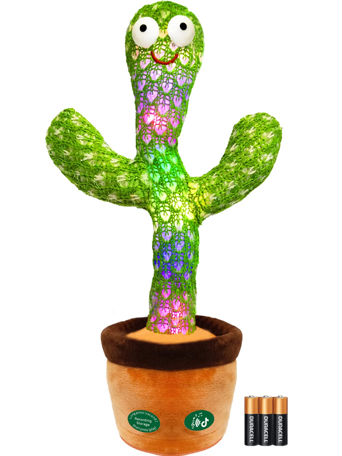 - [LED Colorful Flashing Cactus Toy] You can use repeating cactus toy as a bedside lamp to accompany you to sleep. Simply insert 3 AA batteries and power on the toy. Press the button, and the cactus toy mimic will start moving its body and singing joyful songs.
