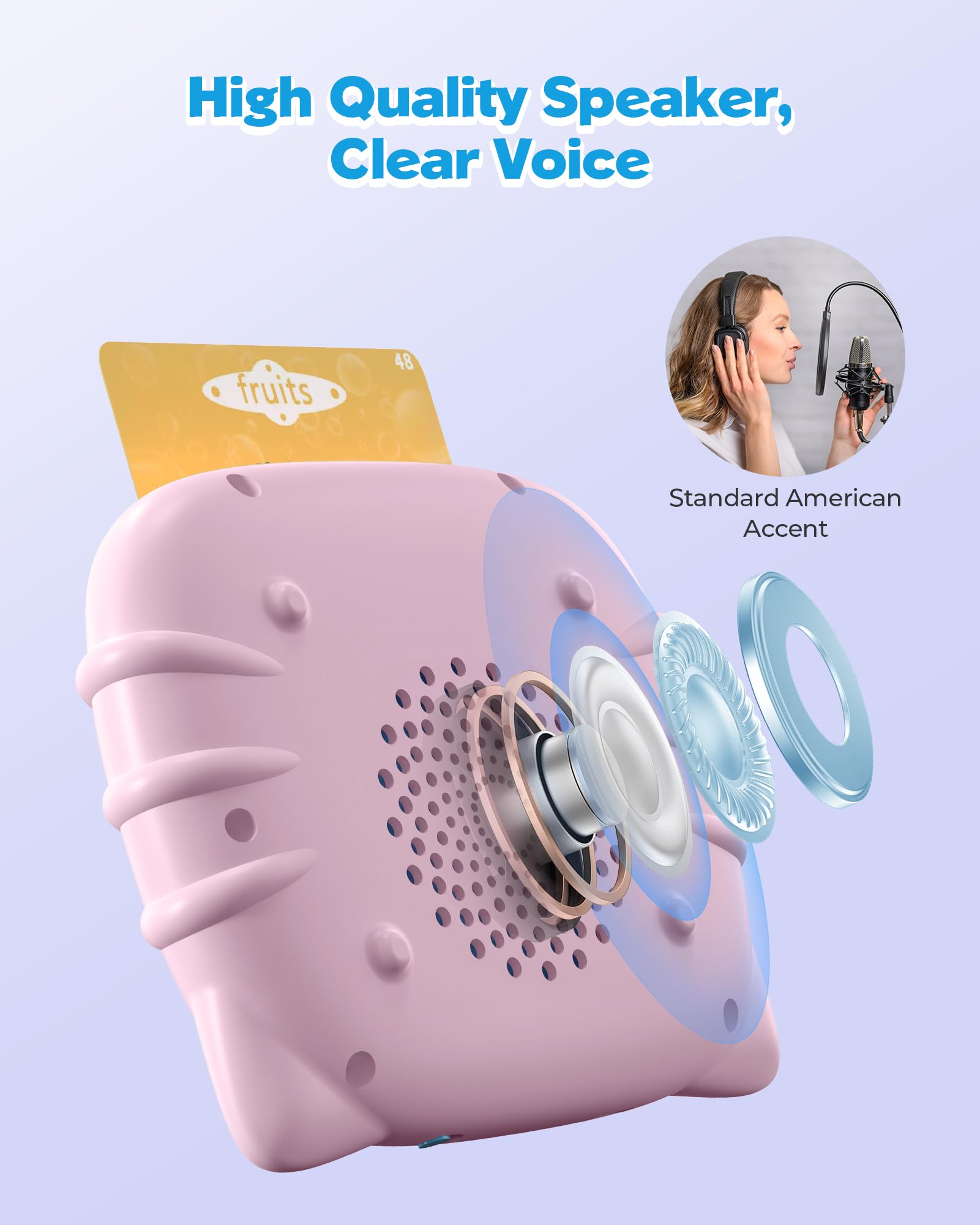 - Easy to Use: Simply turn on the switch, insert a card into the reader, and hear content in a standard American accent. The reader makes real animal sounds and has a repeat button. Adjust volume with a 5-level control. It’s user-friendly for young children